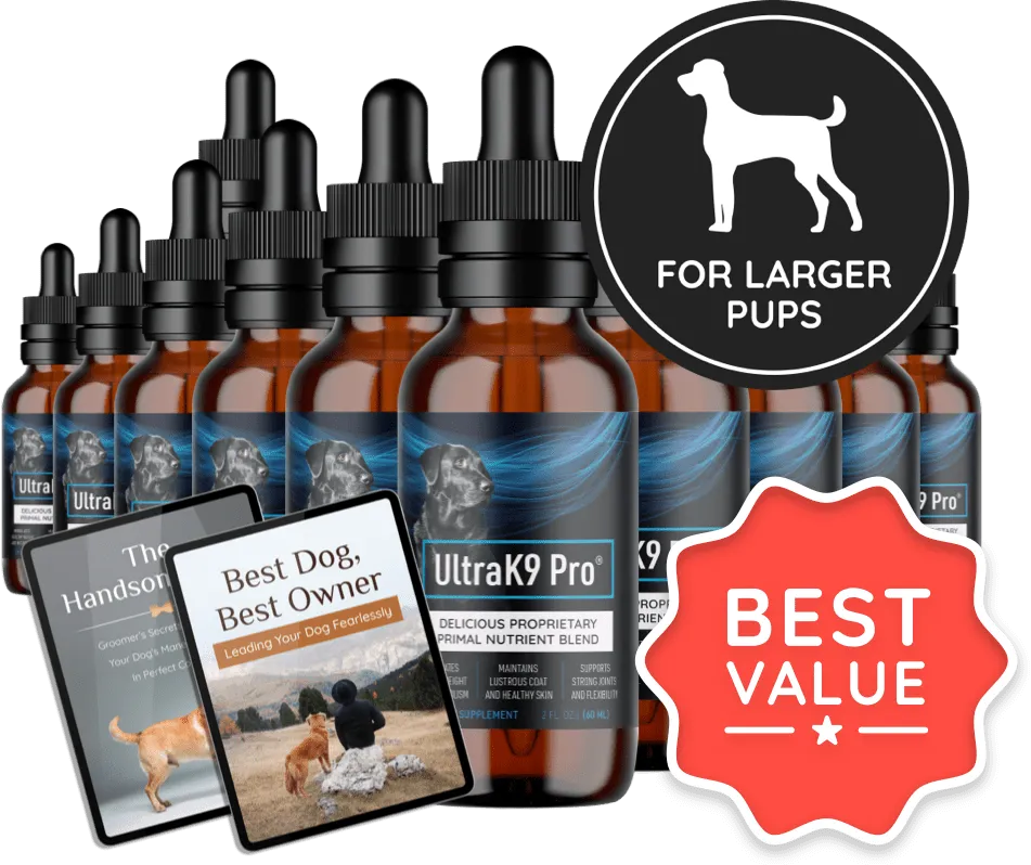 UltraK9 Pro is a premium liquid supplement developed specifically for dogs, formulated with 9 primal nutrients that work from the inside out — detoxifying vital organs, restoring metabolic balance, and activating what the creators call the “Wolf Switch”: the primal health mechanism that modern dogs have lost because of processed commercial food.